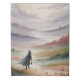 An evocative fantasy watercolor showing a cloaked wizard with a pointed hat and lantern walking alone through a vast, fog-filled valley at dawn. Rolling hills and distant mountains fade into the mist, conveying mystery, adventure, and introspection—great for fantasy lovers, posters, and inspirational prints.