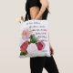 Beautiful inspirational tote bag with a printed image of painted red and white roses. This mug has the Scripture of Isaiah 40:8. The grass withers, flowers fade, but the word of God will stand forever.