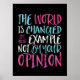 The world is changed by your example not opinion. Inspirational and motivational quote design for those who stand up for equality, choose love over hate and hope for a better world. Inspiring positive saying merchandise for anti-racism and anti-bullying. Uplift and inspire people to be positive, be kind, brave and have the courage to speak up. Always choose kindness, stop hate and stop being racist. Retro and distressed typography design to celebrate life, humanity and honor our differences.