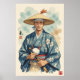 On the left side of the composition, there is an element of Japanese calligraphy. A vertical column of black characters, with a small red chop or seal below it, adds an authentic stylistic detail and may indicate the artist's signature. The overall impression is one of stoicism, dignity, and historical homage.