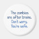Great gift for zombie lovers and a way to tell someone they are stupid! Reads " The zombies are after brains. Don't worry. You're safe."