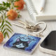 This whimsical keychain features a smiling tuxedo cat surrounded by a lovely blue white purple night sky finished as an oil paint print.