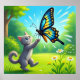 This whimsical poster features a colorful butterfly and a friendly grey cat playing outside. Finished in an oil paint print.