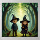 This whimsical poster features two young witches standing in a mystical forest, wearing pointed hats and holding broomsticks. The forest path is illuminated by golden sunlight filtering through the tall trees, creating a magical atmosphere. Their outfits consist of a blue coat and brown pants for one, and a dark dress for the other, drawn in a cute whimsical style. Finished as an oil watercolor art print.