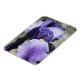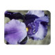 A photograph of a new purple Iris flower blossom. The background is a boulder in the garden.