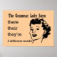 Grammar Lady Says: there, their, and they're are three different words! Grammar Lady wants you to remember that "there" is a place, "their" is possessive "belonging to them", and "they're" is a contraction of "they are". Simple single color design with text and face.