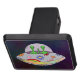 In this fun sci-fi illustration by Richard H. Fay, groovy green aliens ride in a flying saucer decorated with flowers, hearts, a star, and a rainbow.