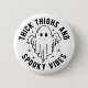 This fun and spooky Halloween design features the phrase "Thick Thighs and Spooky Vibes" arranged in a circular layout around a cute, classic ghost illustration. The ghost, with its simple yet expressive eyes, is the central focus of the design, giving it a playful and whimsical vibe. Hanging from the ghost's hands are two small spiders, adding a touch of creepiness to the otherwise light-hearted design. The text is bold and clean, creating a strong visual impact while maintaining a playful tone. The black and white color scheme gives the design a timeless and versatile look, making it perfect for Halloween.