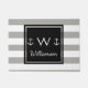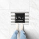 Modern thick white nautical stripes pattern with accenting grey stripes (can be changed via the "Customize It!" button). The center features a black decorative square and your personalized monogram letter and full family name in white accented with anchors.