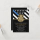 This design features a police force flag with black and white stripes, and a thin blue line stripe as well. The police badge and gold text sits above all of the party details for the retiring law enforcement officer, sheriff, captain, or chiefs retirement party details.