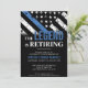 This design features a police force flag with black and white stripes, and a thin blue line stripe as well. "The Legend is Retiring" text sits above all of the party details for the retiring law enforcement officer, sheriff, captain, or chiefs retirement party details.