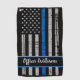 Show your support and pride for our Police with these Thin Blue Line golf towel - American flag in Police Flag colors , distressed design . Thin Blue Line Golf Towels are perfect for a gift at police retirement parties , memorial events , and a wonderful gift to your favorite police officer . Personalize with Name .