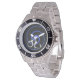 Has heft and feel of expensive stainless steel quartz watches. Good band with safety catch. I removed links, which is easy because engraved arrows show direction to push the linking pins. As always by this seller, the image (a railroad logo) is a perfect reproduction of my emailed image, and is precisely spaced and aligned.