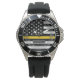 Show your appreciation for the men and women of police dispatch with this thin gold line American flag style watch. This watch features the American flag in black and white with a blue line running across the center. A black nameplate sits towards the bottom of the timepiece featuring your name or your gift recipient's name in an elegant yet strong font. This makes a great gift for any rookie police officer or retiree, or maybe for an officer who just got a promotion. I.e. Cadet' Lieutenant' Sergeant, Rookie.