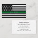 This is a professional business card for military, park rangers, conservation workers and border patrol. The front of the card features an American Flag with the thin green line and your name on top in white typography. The back of the card has black text on a white background and includes all of your contact information, name, work place, phone, email, website and address.