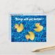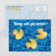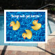 A photograph of rubber ducks with swimming pool water background in no particular order with the words above, "Things will get better.*" On the back the corresponding asterisk and the text, "Once you get your ducks in a row." Below three little ducks in a row with the word "quack" in front. A little encouragement goes a long way. Image copyright 2012 by Margaret E. Cmelik.