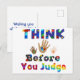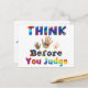 The message of “THINK Before You Judge” with hands of diversity and inclusion to respect people with autistic spectrum disorders and encourage kindness toward each other.