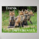 Four red fox kits are pictured with three gazing off at something and the fourth staring straight at the viewer.