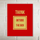 Fun and intelligent, witty slogan on a poster. 'Think' in a golden color, outside the box, in which are the words 'outside the box' in blood red.