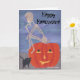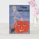 Share some fun greetings with this painting of a thinker skeleton sitting on a Halloween pumpkin, greeting card. There is a black cat rubbing up against the pumpkin.