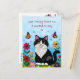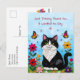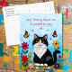 A sweet postcard to say hi to a familiy member or friend with a cute illustration of a black and white cat surrounded by flowers and butterflies in a paper quilling impasto style.
