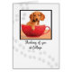 Bring a smile to your college student who is studying at university. A dachshund puppy is sitting in a cup with dog prints surrounding.