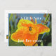 This postcard features a large canna lily bloom that is being visited by a beautiful bee. This flower photo captures the bright orange and yellow petals with a blue sky and green foliage muted around the bloom. "A Little Note Just Bee-cause" is the bee pun that compliments this nature photograph. The back allows for plenty of room for your customized message.