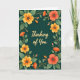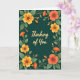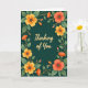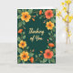 This card features a deep teal background with a leafy floral border that feels like it’s gently wrapping around a quiet note of affection 💚. In the center, the words “Thinking of You” sit prominently in warm gold lettering, drawing your eye straight in. Around the edges, marigold-yellow and coral-orange flowers open in layered petals, like they’re leaning toward the message the way close friends lean in to listen. Smaller buds and muted green leaves fill the gaps, their fine veins and soft shading adding depth without looking heavy. The border curves and dips in an easy, natural rhythm, giving the layout a relaxed, intimate look. Subtle shadows under petals and foliage make the blooms appear slightly raised, as if they’re hovering above the teal field. Gold text remains centered and unobstructed, framed by clusters of leaves and blossoms that thicken at the corners and thin along the sides ☘️.