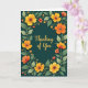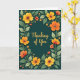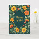 This greeting card features the words “Thinking of You” centered in warm golden lettering, like a gentle note held close between friends. A deep teal background sets a calm evening-like scene, making the surrounding flowers feel even more inviting 💚. Large yellow blooms and bright orange flowers ring the message, their layered petals and darker centers drawing your eye inward. Emerald and sage-green leaves weave between the blossoms, with fine veins and soft shading that make them look slightly raised. Small scarlet buds and tiny star-shaped flowers scatter around the border, like little sparks of attention that echo quiet affection ☘️. Curving stems and tendrils sweep around the frame, guiding the gaze in a slow circle back to the center text. The golden “Thinking of You” sits neatly inside the floral border, with the brightest yellow and orange petals clustered most densely along the top-left and bottom-right edges.
