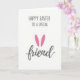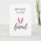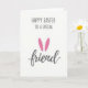 This greeting card features a soft white background with lots of open space, keeping the look airy and calm. Centered on the front, a short Easter greeting is set in a simple, modern type style in charcoal gray, stacked in neat lines. Near the end of the message, the word “friend” appears in a flowing, calligraphic look, adding a gentle, affectionate touch as if written for someone close. Between the typed lines and the final word, two bright fuchsia oval shapes sit upright like bunny ears, bringing a sweet hint of closeness 🐰. The strong pink accents stand out against the muted gray text, like a small blush in an otherwise quiet palette. Everything is aligned around the middle of the card, with the text and shapes forming a tidy vertical arrangement that feels balanced and easy to read 🌷. Two fuchsia ear-like ovals sit near the center, just above the word “friend.”