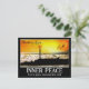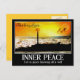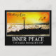 An image of a person sitting at the end of some rocks under a beautiful sunset with seagulls flying past a full moon. Sayings printed on the postcard " INNER PEACE", I sit in peace knowing all is well.
