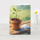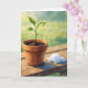 A young plant in a terracotta pot basks in sunlight on a wooden surface, its green leaves contrasting with a small pile of melting snow captured in watercolor.