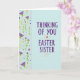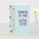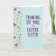 This design shows a tall layout with a decorative spring strip running down the left side and a wide, pale blue panel on the right. Along the border, purple fan-shaped blossoms with white-tipped petals rise on slim green stems, mingling with small flowers in yellow, orange, and light purple for a friendly, sharing feel 🌷. The border background is sprinkled with teal, orange, and deep purple dots, tiny stars, and abstract shapes that add a light, confetti-like texture. On the open blue area, the main text sits centered and reads “THINKING OF YOU at EASTER SISTER” in deep purple, arranged in stacked lines for easy reading. The word “at” is circled with a thin, sketchy orange ring, like a gentle nudge that draws the eye without taking over. Under the last word, an orange flourish curls like a small ribbon, adding a soft, affectionate finish 🐰. The left border stays busy with layered petals and scattered speckles, while the right side remains airy and calm in pale azure.