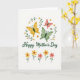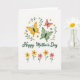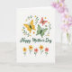 This design shows a white background crowned by three stylized winged insects in golden yellow, soft sage green, and gentle coral, their open wings hovering close together like friends sharing a quiet moment ❤️. A curved frame of thin green vines arches around them, dotted with tiny blossoms in pale yellow and creamy white with small contrasting centers. Centered beneath this airy scene, the words “Happy Mother’s Day” appear in flowing emerald lettering that echoes the greenery above. The composition feels springlike and affectionate through the way the colors softly lean toward one another rather than competing. Along the bottom, five simple flowers stand in a neat row, alternating sunny yellow and coral petals for a balanced look. Small red heart shapes sit inside the blooms, adding a tender, romantic accent without overpowering the design 🌼. Slender green stems and minimal leaves keep the lower border light and orderly, with the hearts clearly visible near the center of each flower.