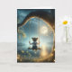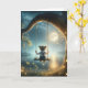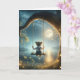 Fireflies are hovering around a teddy bear who is wearing overalls on a swing attached to a tree branch, gazing at the moonlit sky.