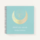Chic and elegant notebook featuring a faux gold foil holographic illustration of a third eye over crescent moon decorated with leaves on a magical teal blue color background.