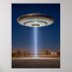 A flying saucer-shaped spacecraft hovering over a fenced military facility that is supposed to be zone 51 or area 51. A powerful ray of light descends from the center of the UFO towards the entrance of a restricted area, illuminating the starry night and the surrounding desert space.