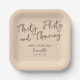 Thirty Flirty and Thriving Script 30th Birthday Paper Plates features a neutral brown and beige palette with simple typography. The elegant combination of script and serif fonts highlights the playful and empowering phrase "Thirty, Flirty and Thriving", perfect for a stylish milestone celebration.