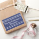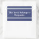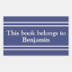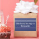 This blue bookplate sticker has two white stripes above the text and 2 white stripes below the words. The white letters read "This book belongs to" and there is a place for the recipient's name.