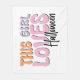 This playful and colorful design features the phrase "This Girl Loves Halloween" in bold, retro-style lettering. The text is divided into three lines, with each line having a distinct color palette. The word "THIS" is in a soft, textured orange, "GIRL" in a pastel purple, and "LOVES" in a light, bubblegum pink. The word "Halloween" is scripted in a smooth, black cursive, adding contrast and balance to the design. Each letter has a slightly rounded, bubbly shape, giving the design a fun and whimsical feel, perfect for celebrating the festive and lighthearted spirit of Halloween.