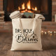 This tote bag features the words "This House Believes" in black scripted font with a black rooftop, heart and Christian cross. Customize by adding your family name or personal text.