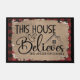 This modern farmhouse doormat features the Christian proclamation "This House Believes" on a tattered looking burlap background framed by a red and black buffalo plaid pattern. The faux distressed look is framed by a black border and the interior design includes a house rooftop and Christian cross with heart details. Add your family name or custom text to make this doormat uniquely yours. Order today for yourself or to give as a special gift.