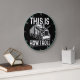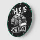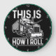This bold wall clock humorously declares a truck driver's way of life. Against a black background with a vibrant green rim, it features a white illustration of a large semi-truck with its trailer. The prominent text "THIS IS HOW I ROLL" is displayed in distressed white lettering, making a confident and witty statement about the trucking profession.