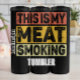 This graphic features a humorous, retro-style design with stacked colored rectangles. The words 'THIS IS MY MEAT SMOKING' are in a bold, distressed font within these blocks, with the word 'TUMBLER' below, creating a witty graphic for a barbecue enthusiast or grill master.