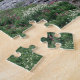 A puzzle that has five pictures on it, a dock, a waterfall, a creek, a forest, and in the center, a Crysanthemum.