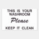 This is your washroom please keep it clean sticker. great sticker to put on a bathroom mirror or door to trmind employees that this is their washroom and they should keep it clean for their own sake. This is your washroom please keep it clean stickers can be used in all businesses.This is English, I also have this in Spanish in my store.