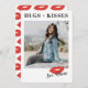 Perfect for a boyfriend, husband, or lover, this flirty Polaroid-inspired Valentine's Day card features a large photo with a hand-drawn kiss illustration overlay. The "Hugs + Kisses" greeting is prominently placed at the top of the card in a bold serif font, while a modern cursive font is used for the customer's name below. A coordinating kiss pattern is featured on the back side of the card.