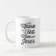 This cute mug for caffeine-loving moms features the quote "this mama runs on tea, wine and Jesus" in black vintage distressed script lettering. A funny and modern Christian design for busy mothers.