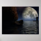 A Viking ship approaches a strange land on a moon lite night.