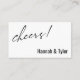 This suite's distinction is due to the contemporary script font used for accent phrases. In this piece, the elegant font was used to create a graphic depicting the words "this one is on us", placed on the front, and "cheers!" on the back. Use the template fields to add your personal details and make this unique, modern design your own. The background can be changed to any color you prefer. Please reach out with any special requests or for customizing assistance. // 158 //